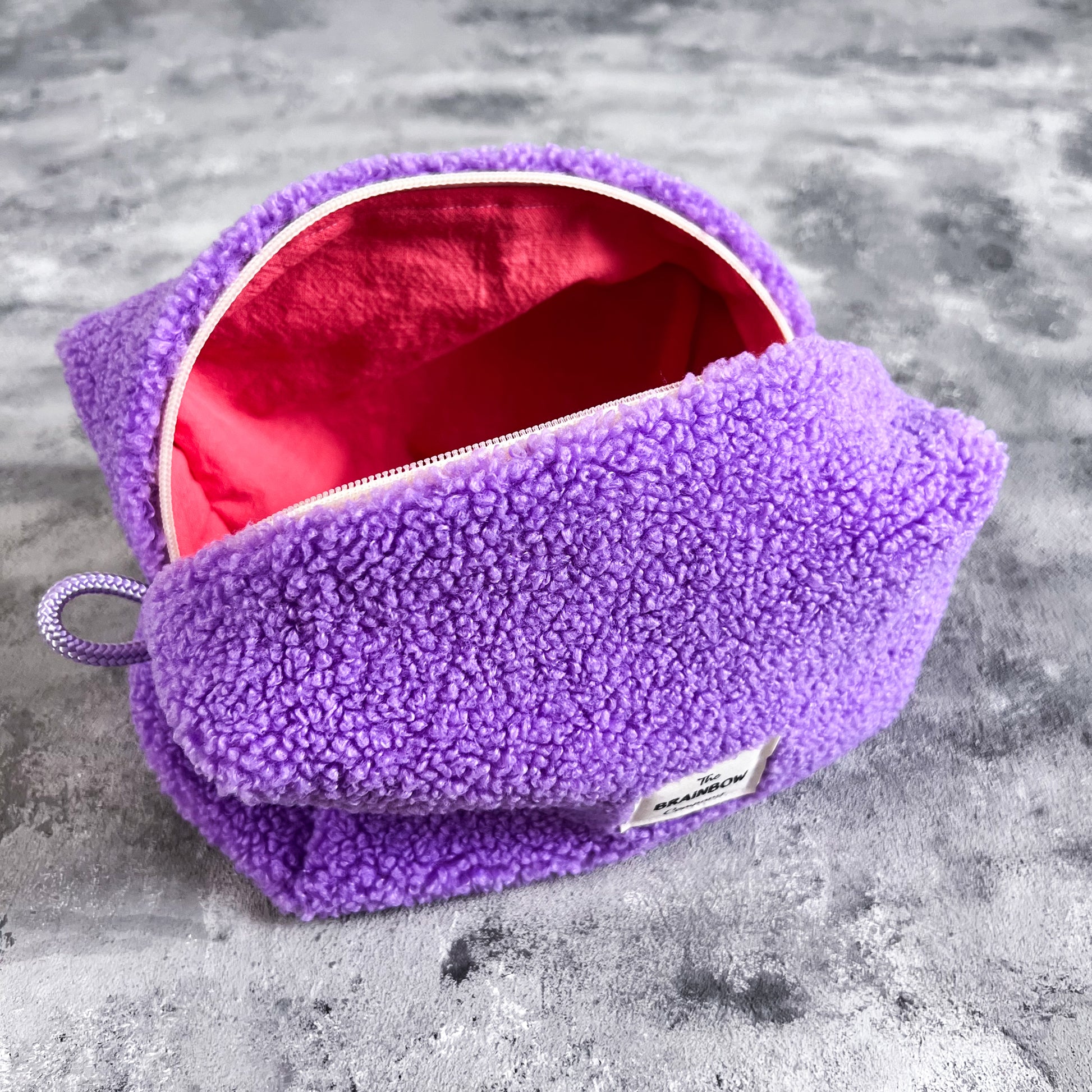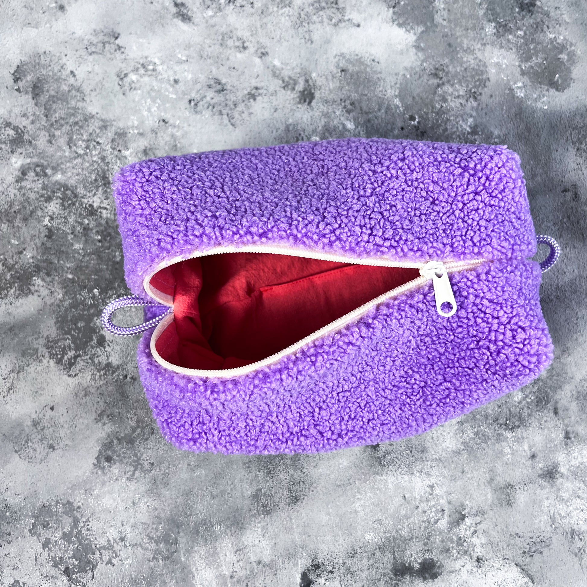 Coole Boxy Bag aus weichem Teddystoff, die sich weit öffnen lässt und viel Stauraum für all deine Produkte bietet.